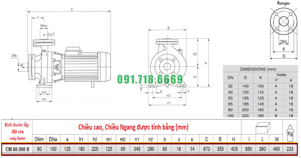 Kích thước máy bơm nước li tâm trục ngang CM80-200B có điện áp 380v